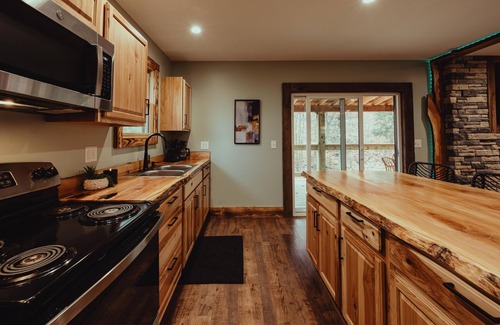 The Edge Cabin is the perfect outdoor escape for up to 6 people, including two queen beds and a sofa bed. This unique cabin is a beautiful space to escape the everyday hustle and bustle. It features a spacious living room, fully equipped kitchen, wi-fi, Roku TV, and fireplace. The exterior deck includes a private hot tub, fire pit, gas grill, a spacious patio for outdoor dining and seating.