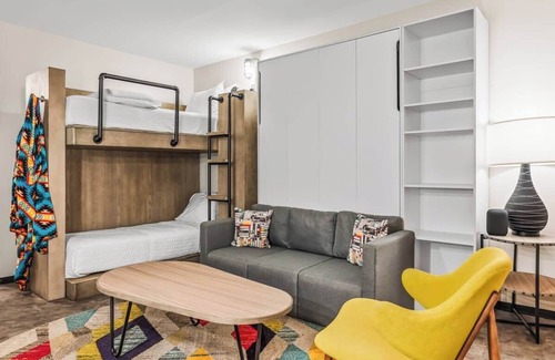 Comfortable Seating/chill space: Single bunk beds and retro-inspired seating area features a funky murphy bed and a small table, perfect for playing games or enjoying your favorite snacks.