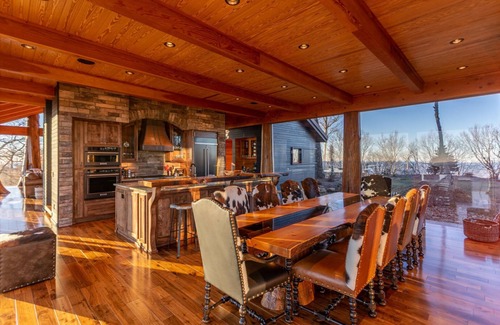 With its awe-inspiring glass walls, The Flying Eagle is a home like no other. Recently featured on the cover of Log Cabin Homes, it sits perched at the top of Eagles Nest. You'll have stunning views of the Elk River Valley as well as views towards Tennessee. The main floor has the living room, dining for ten, and gourmet kitchen. The kitchen has a large granite island, wine cooler, and large range to cook for the entire group. There is an indoor table for ten, and beautiful bar stools for five. In the living room, you'll find a gas fireplace and a large smart TV with YouTube TV for live viewing.