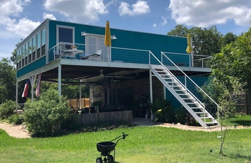 Welcome to the Frio River Paradise, our New, very Unique and Custom Home located on the banks of the Frio River. Our vacation retreat is perfectly situated on a beatiful 1.6 acre private bend in the Frio. Our home is a 3 bedroom, 3 Bath, newly built Custom Container House. It is totally custom, and well suited for RiverLife, this home has been built from the ground up, and has unique features throughout. It's approximately 2000 sf and will accommodate up to 10 guests. Each Upstairs Room has a "Purple" queen size bed, with private bathroom of which each is stylish in decoration. A queen pullout sofa with Memory Foam mattress. The downstairs bedroom is large screened room, with again a queen size "Purple" mattress and a set of Twin Bunk beds, and sitting area. It is a nice Air Conditioned room to sleep with the large window wall, with the windows open and listen to the river and frogs or watch the Fireflies. Note: Our home is 2 story. There are outdoor stairs to main level. Please consider this if stairs are an issue for your mobility. There is a large 900 sf covered concrete patio underneath the home, well equipped for all your river fun, with large patio table, and lounges to enjoy the shade and breeze, large Gas/Charcoal grill to cook up all your delicious treats. There is also a 300 sf patio/balcony on the 2nd floor with table to enjoy river and hill country views, as well as do some star gazing, the skies are simple gorgeous at night. Our Home is fully equipped and furnished for your needs, all essentials are included in the Rental, including but not limited to all Linens, Towels, Toiletries, cookware, dinnerware, water toys, Kayaks grill, fire pit, and many other items of everyday use for Splashing in the water or cooking a 5 course meal. It's all there for your use. We own approx 150 feet of river frontage, with a white sandy beach area, and green St. Augustine grass area under large Cypress Trees, there is a table, chairs, and hammocks by the river for lounging as well as fire pit. Water depth from 6 inches of rocky bottom, to 6 feet of swimming hole. The fishing is fantastic in the upper/deeper portion of the Frio River. We have fishing and river kayaks available for use, lots of water toys, a rope swing, and of course floats/tubes for lounging in the river and sun. With kayaks its possible to explore much of the river from our location without a pick up service. Our home is very modern with all conveniences, with a private bath for every room,washer and dryer as well, this in not the average vacation rental, this is our personal vacation home, we want it to feel like your home as well. Please feel free to use any and all parts of the property, we just ask that you leave it as you found it. We have planted lush grass, and beautiful flowers, and have well established pecan trees, around the home we have put out wildlife feeders and provide a beautiful area for migrating animals and the local wildlife to visit, pay attention you can see many varieties of birds and animals. Come enjoy the crystal clear spring water of the Frio River, stay a day, week or as long as you like, you will make memories of a lifetime.