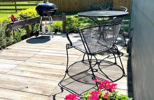 NO carpet floors! Comfortable and Fresh New mattresses, Bathroom and kitchen. Fire pit area, wood deck, charcoal Grill and fenced backyard!