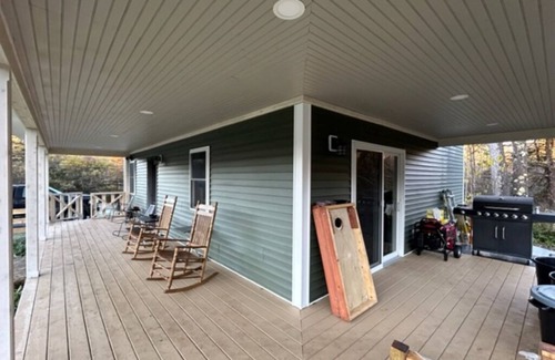 You will be welcomed by a large, wrap-around porch, including outdoor seating; a propane gas grill; and a deck-mounted bike stand for tinkering and adjustments. The main floor has an open-floor plan; purposefully designed to include an entertaining space with a propane fireplace and Smart TV, adjoining a fully equipped kitchen with all new appliances. Every detail has been considered to make the cooking and gathering experience enjoyable. In addition, the first level contains a dining room area with seating for 6; as well as a bathroom with walk-in shower.