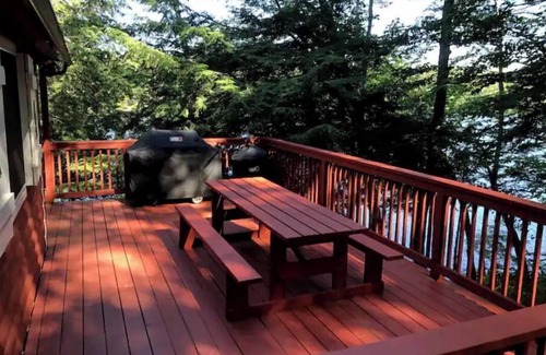 Secluded, log-sided cabin just 40 ft. from pristine lake shore. In addition to modern amenities, comes with lovely stone fireplace, private swimming dock, an enclosed outdoor shower with dressing room, a rowboat, canoe, kayaks (4 full-size and 3 youth)and loons to serenade you!