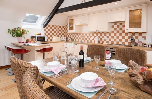 Kitchen/dining with electric oven, 4 ring electric hob, small integrated dishwasher, fridge with icebox, microwave. Breakfast bar area with four bar stools. Dining space with seating for four.