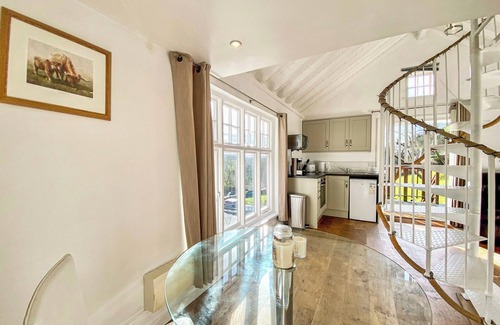 Shower Room: Cubicle Shower, Heated Towel Rail, Toilet. Electric central heating, electricity, bed linen, towels and Wi-Fi included. Welcome pack. Front garden with sitting out area. Decking area with garden furniture. Private parking for 2 cars. No smoking. Please note: There are steps in garden. Low ceiling in bedroom.. What a fabulous property! If you are looking for a complete rest and get-away from it all, this is the choice for you. In peace and tranquillity this wonderful lodge completely makes the most of the amazing location, tucked away in a peaceful corner of the owner’s grounds. There is a large decking area right in front, with table and chairs, where you can enjoy the expansive views over the Slad Valley. Inside, on the ground floor is the open plan living area with mezzanine above, featuring a sofa, Smart TV, a well-equipped kitchen area and shower room. Appreciate the natural beauty surrounding you while you dine at the glass table, admiring the view from the large window. Up the spiral staircase will lead you to the mezzanine bedroom with double bed (there is a restricted headrooom). From the ground floor there are patio doors which open to enable you to enjoy warm evenings and days while watching the wildlife.