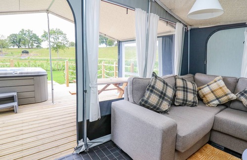 There is a kitchen/living room with electric oven, two-ring hob, fridge with ice box and a sitting area with TV. The bedrooms have a double and a triple bunk bed, along with two external, shared shower rooms. Outside, there is a private decked area with a fire pit, a hot tub and furntiure, as well as off-road parking for one car. Fuel, power, bed linen and towels are all included in the price. Apologies, no pets and no smoking. Within 4.7 miles there is a shop and pub. The Heron is a delightful base for exploring the countryside of Powys.