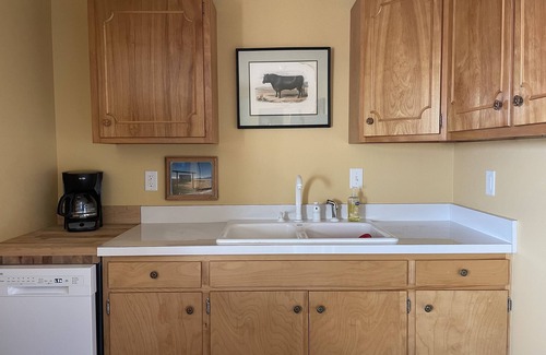 Kitchen with full size refrigerator, dish washer, gas stove w/oven, microwave and all amenities to make your meal, condiments, pots/ pans, dishes, with a dining table that seats 4. If you'd rather enjoy your meals outside, there is a full patio with table and gas grill and furniture to sit and enjoy the views as your waiting on dinner.