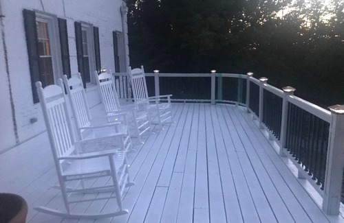 The house has a living room with fireplace, dining room, eat-in kitchen, three bathrooms and four bedrooms. The main bedroom with a King size bed is on the main floor. The other three bedrooms are upstairs. There is a sun porch/solarium with the most beautiful windows that adjust for any amount of light or breeze. The beautiful open porch across the front of the home can accommodate up to fifty guests. The master suite and bathroom on the main level of the home is handicapped accessible. The main level of the home is ADA compliant with wheelchair access to the parking area front and side porches and all rooms on the first floor. The home sleeps 8/10 guests.