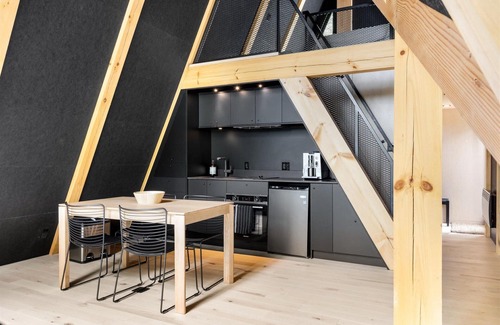 Enjoy a practical kitchen with a built-in oven, small refrigerator, coffee maker, dishes for four, and everything you need to cook delicious meals. A fondue set is also available for cozy dinners with friends or family.