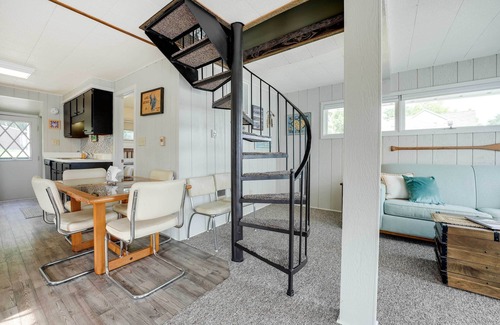 Arrangements for sleeping include a queen bed in the downstairs bedroom. Climbing up the spiral staircase, you'll find lots of space for the kiddos. Three twin beds will sleep them comfortably in the loft for the night. A TV and Xbox with a couple of bean bag chairs gives them some indoor space of their own if there's rain in the forecast or mom and dad just need a break. Additionally, there is a sleeper sofa that can sleep two more in the living room. There is ample space in the bathroom with a full tub and shower.