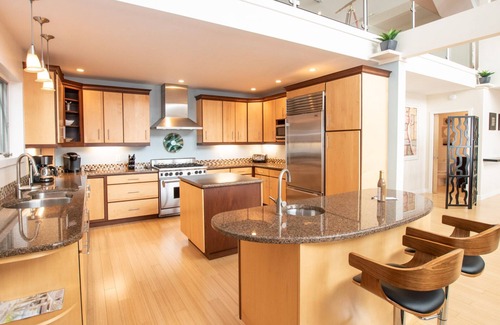 The wide hallway opens up into the great room, featuring a wall of sliding glass doors and chalet style windows to accentuate the stunning view of the lake. Hardwood floors and relaxing colors enhance the feeling of serenity and luxury. A large sectional with Samsung smart TV is available for enjoying a movie or a glass of wine at the end of a busy day. Guests can watch their favorite programs using the TV apps and their accounts (Netflix, Disney+, HBO Max etc.). High speed, fiberoptic internet is available for streaming to personal devices or for those needing to work while on vacation.