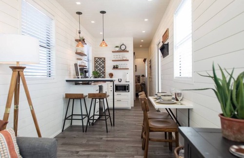 This stunning Container Home will not disappoint! With 1 bedroom and an inflatable floor mattress, it sleeps uptimes to 4 people. Features a super comfy Tuft and Needle queen mattress. The kitchen is outfitted in granite countertops. The rooftop deck is a great place to stargaze or enjoy a morning coffee. It boasts a full size, custom-tiled shower and spacious bathroom to complete this beautiful home. Located right outside of Alpine-2 minutes from downtown.