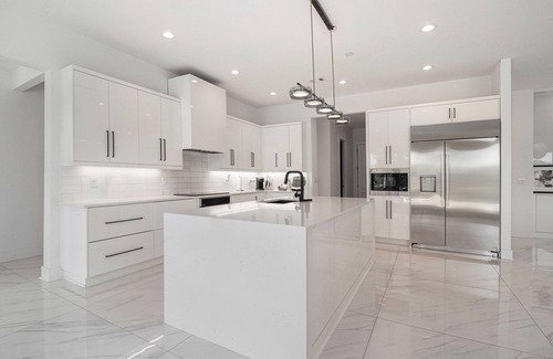 Entertainer’s Dream: Two-story great room with floor-to-ceiling windows, sleek tile floors, and gourmet kitchen with oversized island.