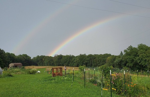 Sip your morning coffee on the front porch overlooking the neighboring valley and farm. While an outdoor shower is not available yet there is a composting toilet and handwashing station nearby. Fires in the neighboring firepit are allowed provided there isn't a drought. A public lean-to structure near the firepit is open for any desires to hang, eat, or cook under.