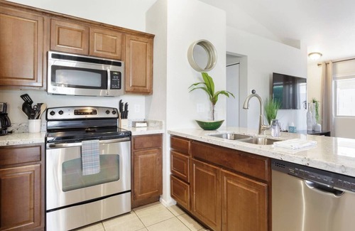 Dive into luxury at this single-family home with a super PRIVATE heated turquoise pool, perfect for a warm midnight swims. (No charge to heat the pool). Pets stay for free! This home features an elegant mix of stone and gold, plus a spacious open-plan layout. Entertain in style with the large updated kitchen. Enjoy a BBQ in the serene outdoor space. Centrally located, it offers easy access to Scottsdale, hiking trails and major freeways. Book now for an exquisite escape!