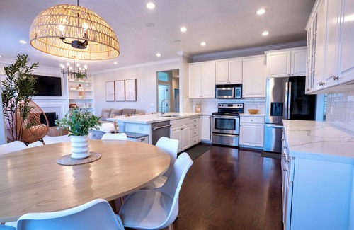 Discover your home-away-from-home in this stunning 3,700 sq ft, three-level retreat. Featuring rich dark hardwood floors, elegant plantation shutters, and newly updated with marble-quartz countertops, this property blends timeless quality with modern comfort. The fresh décor pairs neutral-modern elegance with boho-chic touches, creating a warm and stylish atmosphere for your stay.