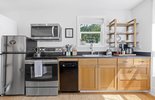 We provide a full kitchen with everything you need to make meals during your stay. There is a comfy living room area with a queen sized sleeper sofa for an additional 2 guests and a smart TV.