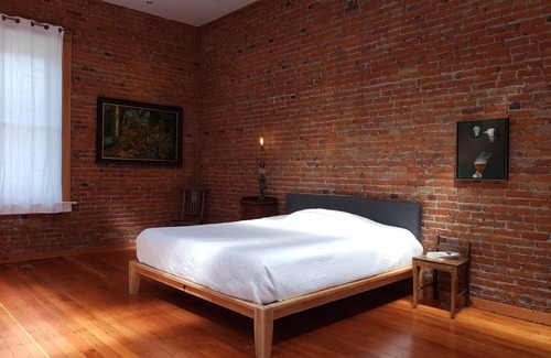 Walk into spacious elegance. Original red brick walls spotlighted with fantastic paintings meet precise sheetrock lines and virgin Douglas Fir floors. Insulated windows, framed with old growth Lodgepole Pine and linen curtains, wash the room in sunset light.