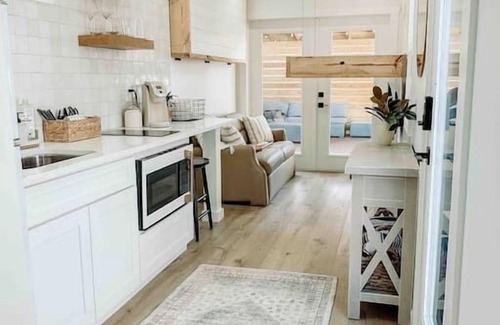 In the kitchenette you’ll find a sizable retro refrigerator, microwave/convection oven, 2-burner stove top, sink and stocked dishes for four people. Enjoy k-cups provided for the Keurig or take a quick drive over to Starbucks. Or our favorite option, try our local coffee shops: “Foxtail” or “Cups and Pups.”