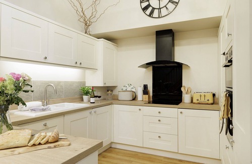 Fully equipped kitchen with double oven, electric hob, fridge/freezer, dishwasher, microwave, toaster, kettle, cafetière, washing machine/tumble dryer and breakfast bar with two stools