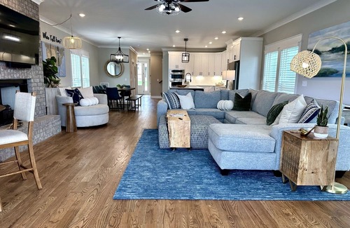 The Tennessee Pearl offers ample space for your group of 10 with a spacious living area with a Smart TV, sectional sofa, table shuffleboard, dining area with plenty of seating, and a half bath. You can whip up meals and snacks in our well-appointed kitchen with an oversized island and craft ice maker, then relax on our deck as you soak up the incredible lake views. We have chairs and a couch on the covered deck overlooking the water along with a blackstone grill. From here, you can head down to the grassy area, beach and the waterline, or our spiral staircase takes you to the top deck just off the main bedroom.