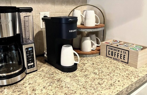 Fully-stocked kitchen with all main appliances, ready for grilling, boiling, baking, broiling, or just burning a little toast. Full coffee station with a variety of flavors. Large adjacent dining perfect for the large and small groups gathering ‘round the table.