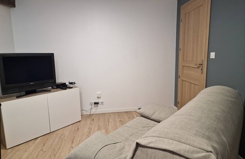 Small contemporary townhouse in the heart of Ornans composed of a kitchen open to living room, bathroom, living room with sofa bed, and a bedroom.