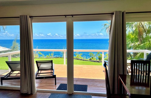 Immediately as you enter the home your attention is drawn to the vast ocean front windows and sliding glass doors that lead out to the huge deck. Here you can spend endless hours enjoying the cool breezes from the ocean, sipping on a morning cup of coffee or watching spinner dolphins and whales playfully swim by. During whale season, there may even be nights when you can hear the whales singing. The windows have blackout curtains to shade the interior and cool the house during peak sunshine hours.
