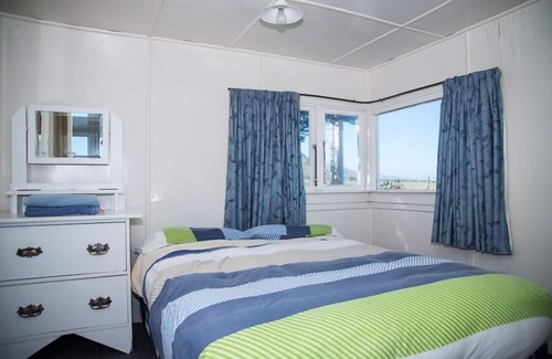 A rare find today, Russ bach is located within 5 metres of the Pacific Ocean. Historically it was built by Russ Broughton, a fisherman at Glenburn for some 40 years. Typically for that time, it started as a 2 bedroom whare, which has been added on to over the years, now it can sleep 10 people in 3 rooms. The kitchen/ dining room has 2 separate bedrooms along one wall, with double beds, a door on to the porch leads you into a bigger room that has 2 single beds and 2 bunk beds. This room acts as the lounge as well, with 3 cane chairs and a coffee table, a TV is hung on the wall for DVDs , and an assortment of books, magazines and games sits beneath it.