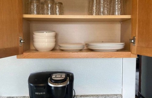The bedroom offers a queen-sized bed and large dresser to comfortably accommodate up to 2 guests. There is a quiet space with a desk and a chair for you to complete any work. Enjoy our fully equipped kitchen with full-sized appliances, including a coffee maker. There is a small dining area next to the kitchen. This cozy living room features a plush loveseat, an oversized lounge chair, and 50” Smart TV that allows access to all streaming services.