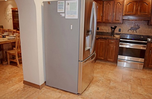 Sometimes described as a chalet on steroids, this custom built home was intended to be the perfect retirement home for a local builder. It features all kinds of unique and special amenities such as a formal dining room (1 of only 2 in Red River), an outdoor kitchen (huge grill & sink) coupled with a wood-burning fireplace located above the roofline so you can gaze at the mountains or look down on the flower garden, and a 4 car garage (3 available to guests) deep enough to park 8 compact cars! This amazing home, newly redecorated, provides guests with a true taste of luxury: from the new stainless steel appliances and granite countertops in the kitchen to the ice maker and wine chiller in the wet bar to the Jacuzzi tub in the master suite to the new washer/dryer in the huge tiled laundry room (also with a utility sink) to the custom tile work in the kitchen/dining room/breakfast area to the new stain master carpet to the new 60" flat-screen TV in the family room. Every bedroom is decorated with its own theme, features 800 thread count sheets, and the thickest, warmest blankets you've ever seen for those cold winter nights. The top floor features 5 bedrooms--one master king suite, a second king master, and 3 comfy queen rooms--each with its own TV. The master suite or Captain's Quarters (decorated with Indian decor including a Pendleton wool blanket spread) sleeps 2 and has a private balcony, a large master bath with a Jacuzzi tub, and a large dressing room with cedar lined closets. Two twin cats in the dressing room accommodate smaller children or even petite adults. The second master (the Artist's Room) sleeps 4 in a new king plus queen sleeper sofa. It too has a private balcony plus an in-room sink and electric recliner. A mix of cowboy and Indian decor, this room contains original artwork by a local artist, a Pendleton Indian blanket spread, and bright colors. The "Cross" Room (sleeps 2) shares a large bath with the second master. The faux-suede bedding, flat-screen TV, and wall decorated with unique crosses from around the world provide a very peaceful, relaxing atmosphere that perfectly fits the Indian worshipping the Great Spirit in the picture over the bed. The Bear Room (sleeps 2), done in hunter greens and rich woody browns, shares a large bath with the Wolf room. The "bear" artwork, from the tapestry bedspread to multiple pictures to a giant wall hanging to 3 wall hooks to the lamps, showcases mothers, cubs, and large males in various scenes and poses, including acute tiny cub perched atop an old tree stump. The Wolf Room (sleep 2) next door, in soothing shades of blue and green, greets guests with an ever so soft blanket/spread and various wolf decor, including one picture of an intense blue-eyed wolf looking right at the bed with his penetrating gaze. Main floor sleeping arrangements include the Cowboy Bunk Room (sleeps 6 in a twin bunk set and a queen bunk set), a second family room (known as the Buffalo Room--sleeps 4 on 2 new queen sleepers), and the sun porch (sleeps 2 on a double futon). The TV in the Bunk Room is functional only for video games brought by guests--bring your own hookups. Other features worth noting are the fully stocked kitchen (spices, Keurig [bring your own K-cups], 2 crock pots, 2 coffee makers, a large wok, lots of large pots, and more), a full outdoor balcony on the main floor with plenty of seating and a grill, a gas log stove in the Buffalo Room, a "landing" on the winding staircase to the upper outdoor area, and an extra frig in the garage for overflow food and drinks. Finally, the Great Room (really!) will impress you with the 2 large rocking chairs in front of the huge wood-burning fireplace topped by an Indian headdress, the massive 60" flat-screen TV with its "surround" seating of 3 sofas and multiple chairs, the numerous skylights, and the 2-story vaulted ceiling surrounded by the second-floor balcony. Truly a luxury home for those who appreciate the finer things in life. Since this grand old lady sleeps 24, it is the perfect place for a wedding, a family reunion, or another special event. If Villa is already rented during your preferred dates, check out the other fabulous properties by the same owner: Running Bear River Lodge (sleeps 24) and Birds and Bears Retreat (sleeps 16), both located on the river. Please see notes for suggestions on what to bring on your Red River Vacation to make your stay more comfortable!