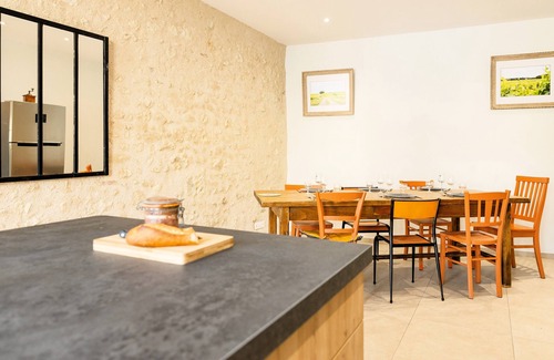 - Large, fully equipped kitchen (induction hob, refrigerator/freezer, oven, microwave, dishwasher, filter coffee maker, kettle, toaster, basic necessities, etc.) with a central island and dining area. The courtyard overlooking the kitchen is not accessible as it is used by the owners who occupy the adjoining house. For outdoor dining, you will need to go upstairs to access the garden. - Living room with wood-burning stove and TV