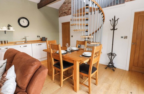 The Warren Barn, a two-storey cottage, consists of a kitchen with oven, hob, fridge, microwave, dishwasher, and toaster, a dining room with seating for four guests, and a sitting area with TV. The bedrooms consist of a ground-floor double and a mezzanine-level double accessed via a spiral staircase, serviced by a shower room with walk-in shower, basin, heated towel rail, and WC. WiFi, fuel, power, bed linen, and towels are included in the rent. Outside, there is a front patio with furniture and off-road parking for one car. One well-behaved dog welcome. Sorry, no smoking. Within 3.1 miles you will find a shop and a pub. Bring your special someone to The Warren Barn for a private retreat. Note: One bedroom is not suitable for the less mobile as steep spiral staircase. Note: There is a ramp to enter the property
