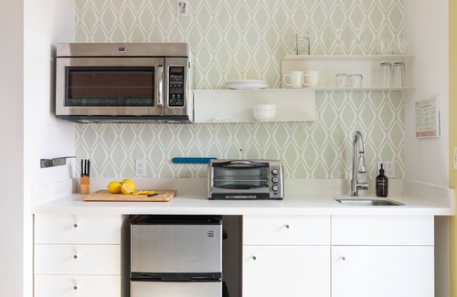 This petite studio is perfect for your stay. The charming décor, wall art, and bright light will put you at ease. The comfortable queen bed is complete with plush linens. The quaint dining set is perfect for a quiet morning to enjoy the steaming hot beverage of your choice. The mini kitchenette is equipped with microwave, refrigerator, coffee maker, and toaster oven. Enjoy a hot shower in the bright and smartly designed bathroom. Catch a movie or your favorite TV show on the mounted flat screen television, and stay connected with Wi-Fi included.