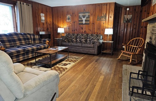 Prepare to unwind in this quaint and tranquil 2-bedroom rustic knotty pine cabin located just across from Rocky Fork Lake in Hillsboro, Ohio. This inviting haven boasts a California King bed, a trundle with two twin beds, and one full bed, accommodating up to 8 guests comfortably. Revel in the calm environment and relax in the expansive living room featuring a cozy queen sofa bed. The cabin is equipped with amenities such as air conditioning, heating, high-speed WiFi, and a fully stocked kitchen with full-size appliances, dishes, cookware, utensils, a coffee pot, and a microwave. Ensure your vacation, holiday, or getaway is memorable by staying with us. Guests need to wash their dishes and clean after their stay, remove their trash all their personal things.