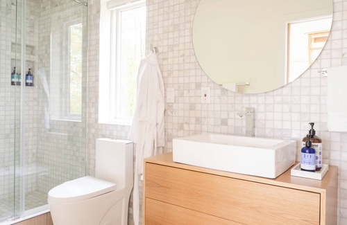 The modern a-frame sits on a private five-acre lot with mountain-bluff views overlooking the beautiful Sequatchie Valley. The valley views are breathtaking, and the rolling mountains of east Tennessee create an enchanting backdrop for outdoor adventures — numerous hiking trails and waterfalls are within 15 to 30-minute drives away. Come home to relax in front of a cozy fireplace and soak in the 7-foot Alaskan-cedar hot tub while enjoying views from 2,000 feet above the valley's farmland.