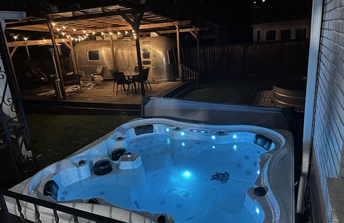 Private fully-fenced backyard with fire pit area, Airstream with covered deck, hanging chairs, stylish & quaint above-ground feeder pool, and hammocks.