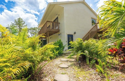 All three bedrooms are all downstairs, one bedroom has a Queen size bed, and the second bedroom has a Full-Size Bed, and the yoga studio room/computer room has a Japanese style Queen size bed available for use and the upstairs living room has a futon with a full-size mattress. The downstairs bathroom is newly remodeled featuring a beautiful stand-up shower featuring a rain on showerhead for an added tranquil experience. The upstairs bathroom features a heart shaped Jacuzzi Tub with Jets and pub lights for a romantic or elevated zen experience. Outside you will find a Florida resort style pool surrounded by tropical lush trees and garden space with a newly built Pergola for added outdoor space for gatherings, yoga, meditation, ceremonies, or family entertainment etc. Next to it is an outdoor seating area with pub lights perfectly placed in a quite nook. There's an outdoor bon fire pit area which is great for family-time and stargazing with seating for 10. The house comes with a cold plunge tub which is great for resetting the nervous system and making it a part of your morning routine as you stay here or as an added feature to your event. There is an outdoor meditation nook with a copper pyramid. The house features a 360-degree wrap around deck giving you a unique experience and views overlooking the pool area and pond/driveway area and our beautiful mango tree and lush garden area all around with a bench and bistro table for making a great spot to enjoy your morning coffee. The dining room features a large farmhouse table with enough seating for 12 which makes a great place to host celebrations. The living room includes a designated workspace with high-speed internet offering a space for remote work. We have a SUP-paddleboard for use for guests during their stay and beach supplies.