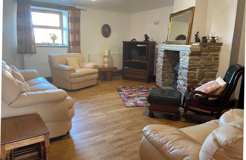 The rooms are large a spacious. The lounge has a stone fireplace with a wood burning stove, a leather three piece suit. The kitchen has a dinning table to seat 6 with all the equipment you need, including fridge freezer, washing machine, dryer, microwave, The rear door opens on to the patio area and garden with garden furniture leading on to the very large shared lawn area. That has ample room for ball games, and views over the open county side. The two bedrooms both have an en-suit shower room .One room has three single beds to other has a king and a single bed. Being next door to High Gate to two properties are ideal for the large party.