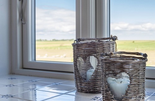 The courtyard, built in 1850, is completely isolated on a mound. Surrounded by 40,000 square meters of garden and meadows, the courtyard is idyllically located approx. 800m from the lighthouse. In 2016 and 2017 it was completely, lovingly and extensively renovated. He got u. a. a thatched roof, new Danish wooden windows, adobe walls and wooden floors. The apartment, Regentrude, has about 130 square meters and has 2 floors. On the ground floor there is the large entrance area with living and dining room with oven and open kitchen as well as a shower room with a large rain shower. The new staircase leads to a large hall. From there you get into the two bedrooms and another shower room also with a large rain shower. The two new bathrooms have windows and offer a view of the old orchard. In autumn and winter the view of the lighthouse falls. The apartment is high quality, u. a. with Riviera Maison furniture, furnished in a maritime style. The kitchen has a free-standing refrigerator with a refrigerator, dishwasher, oven and ceramic hob. Either a Nesspresso or Senseo coffee machine. A dog basket, bowls, blankets and towels are available for the four-legged friends. From June to the end of August you can place your horse on the pasture belonging to the farm.