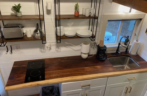 Tiny home with one lofted queen bed and full size futon. Sleeps: 3 Pets: 2 Parking: 1 2- burner cooktop, toaster, microwave, coffee maker and mini fridge. Cookware, dishes, silverware, etc. provided. Shower, sink toilet. Towels, shampoo and soap provided. Dogs are allowed for a one-time, non-refundable cleaning fee of $50 for up to two dogs in rented accommodations. No additional pets are allowed.