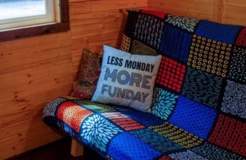 The Hoedown offers a dandy glamping experience with sleeping for four, full bathroom including a full tub and shower, refrigerator/freezer, microwave, and coffee maker. The loft has one plush queen bed with stair access. There is also a queen convertible futon on the main level that doubles as a queen bed by night. Both beds have soft sleep calling linens and pillows. The house is climate controlled with a mini split A/C and heat pump so the house is always to your preferred temperature. You’ll never have to sacrifice the utmost comfort and design while you enjoy the great outdoors of the Longleaf Trace.