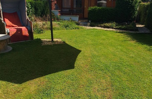 300 sqm own garden as part of a 3.000 sqm large yard all in all. 1 sleeping room, Second bed in the living room. Up to four persons. Small kitchen, shower bath room. WiFi, NETFLIX, PRIME, ALEXA included. Nice dogs are OK. Just call or write for further information. Happy to meet you soon. The jetty is for holiday guests and my all-time tenants. It is at the end of the large yard and about 80m from your terrace.