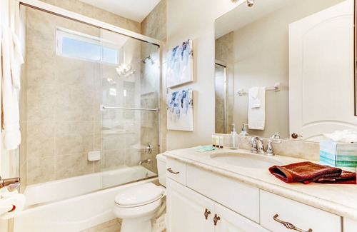 The master bedroom boasts a wall of sliding glass doors opening directly to the entertainment patio. The relaxing decor features heather grays and butter yellows. Other amenities include a king bed, flat-screen Roku TV enabled with Sling, ceiling fan, dedicated seating area and a desk if you just can't get away from work. A wireless printer is also tucked away for your use. This bedroom also enjoys the privacy of an ensuite bath, outfitted with double vanities, a soaking tub, and an oversized walk-in shower.