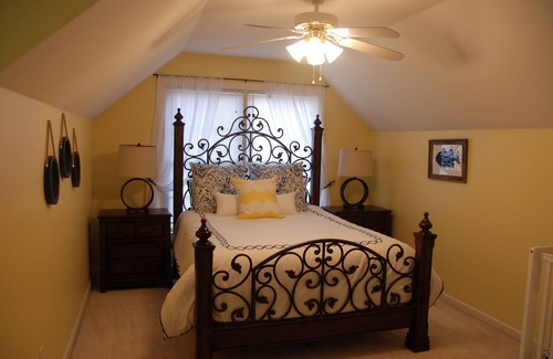 Our home is a 3 bedroom 2.5 bath house that is located at the end of a quite cul-de-sac with a full basement. It has 2,700 square feet of finished living space with a 1,500 square foot unfinished basement. The master bedroom is on the main level and has a king bed and private bath. There is also a half bath on the main level. The upstairs has 2 bedrooms and 1 full bath, each with private access to the top deck for star gazing or watching the boats come down the main channel of the Tennessee River. The home accommodates 6 adults and two children. We do not recommend more than 6 adults due to the current sleeping arrangements.