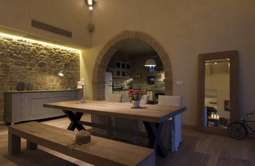 Upon walking through the arched doorway that leads to the spacious entry hall, the first thing visitors notice is the aura of serenity permeating the entire home: the soft, earth tones that grace the walls, extra high ceilings and furnishings, the large French windows that allow the outdoor hues to playfully dance off the walls, the local Cretan stone and wide-planked hard wood floors, the fine art and decorative objects tastefully placed throughout.