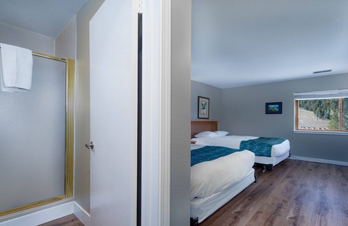 Recently upgraded with LVT flooring and a fresh coat of paint throughout the property. All 10 guests and your pup will have plenty of space to enjoy themselves after a day on the slopes or trails. As you enter the living space, the main focal point is the fireplace flanked by a large window and glass sliding door, showcasing the mountain view on each side. A private balcony provides a cozy outdoor space to appreciate the view. The great room space accommodates all activities to from cooking and dining to playing games and making memories. Each bedroom is its own getaway with two Queen beds and private bathroom. The bedrooms are separated by a hallway for added privacy. Plus, there is a full third bath to get everyone ready at the same time for a day of Kirkwood activities. The living room has a Queen sofa sleeper perfect for two kids.
