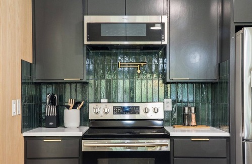 There are plenty of chairs to accommodate large groups between the dinner table – which seats up to 8 guests – and the kitchen island’s 4 stools! Designed to wheat your appetite, this space features modern lighting, a classic wooden dinner table, and sleek chairs to create a restaurant-like atmosphere.