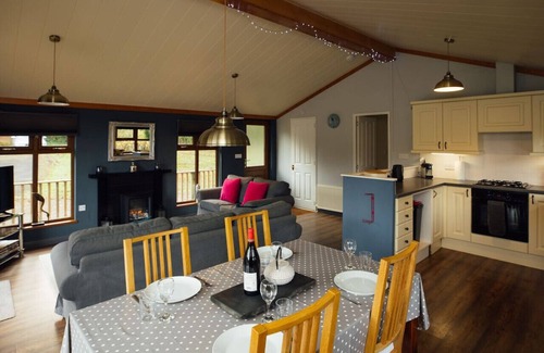 Experience serene comfort at The Willows, a modern 2-bedroom lodge by Salt & City Stays. Nestled in 30 acres of woodland near Narberth, this retreat offers stunning lake views. The open-plan living area features a well-equipped kitchen, dining space, and cosy lounge with an electric fire. Relax on the decked area overlooking the lake, perfect for morning coffee or evening unwinding. Walk into Narberth or explore nearby Tenby, Saundersfoot, and Pembrokeshire's stunning beaches.