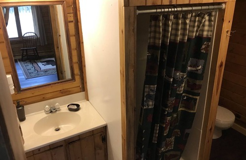 Two bedroom historical Cabin set into the quiet woods. Popular for traveling families, this cabin has a private bath, downstairs bedroom w/ queen bed, loft w queen and twin bed, living room w fold out couch-full size, microwave, refrigerator, coffee maker table and chairs. Relax on the large private deck and BBQ, or head over to the large lawn and use the fire pit and game area.